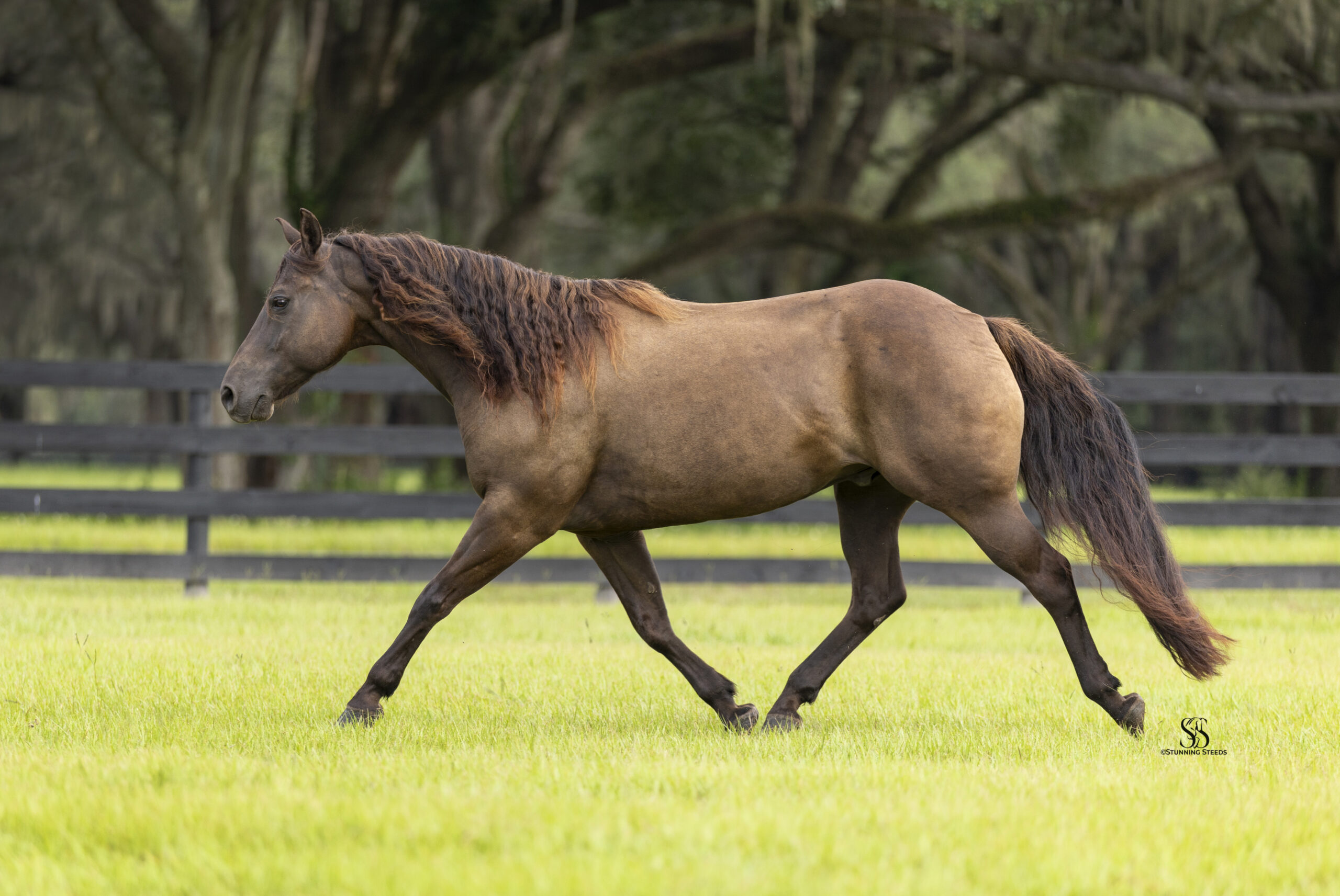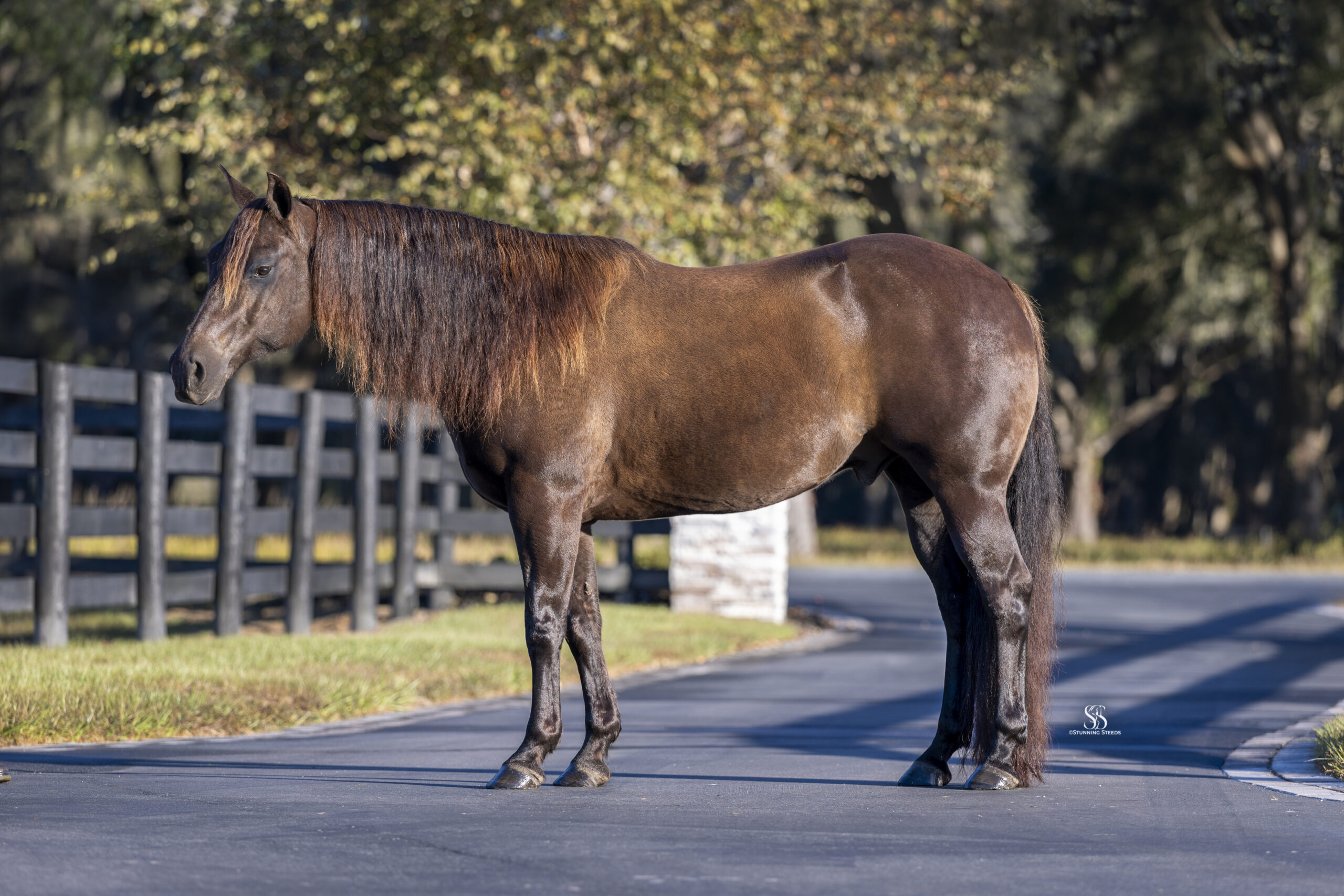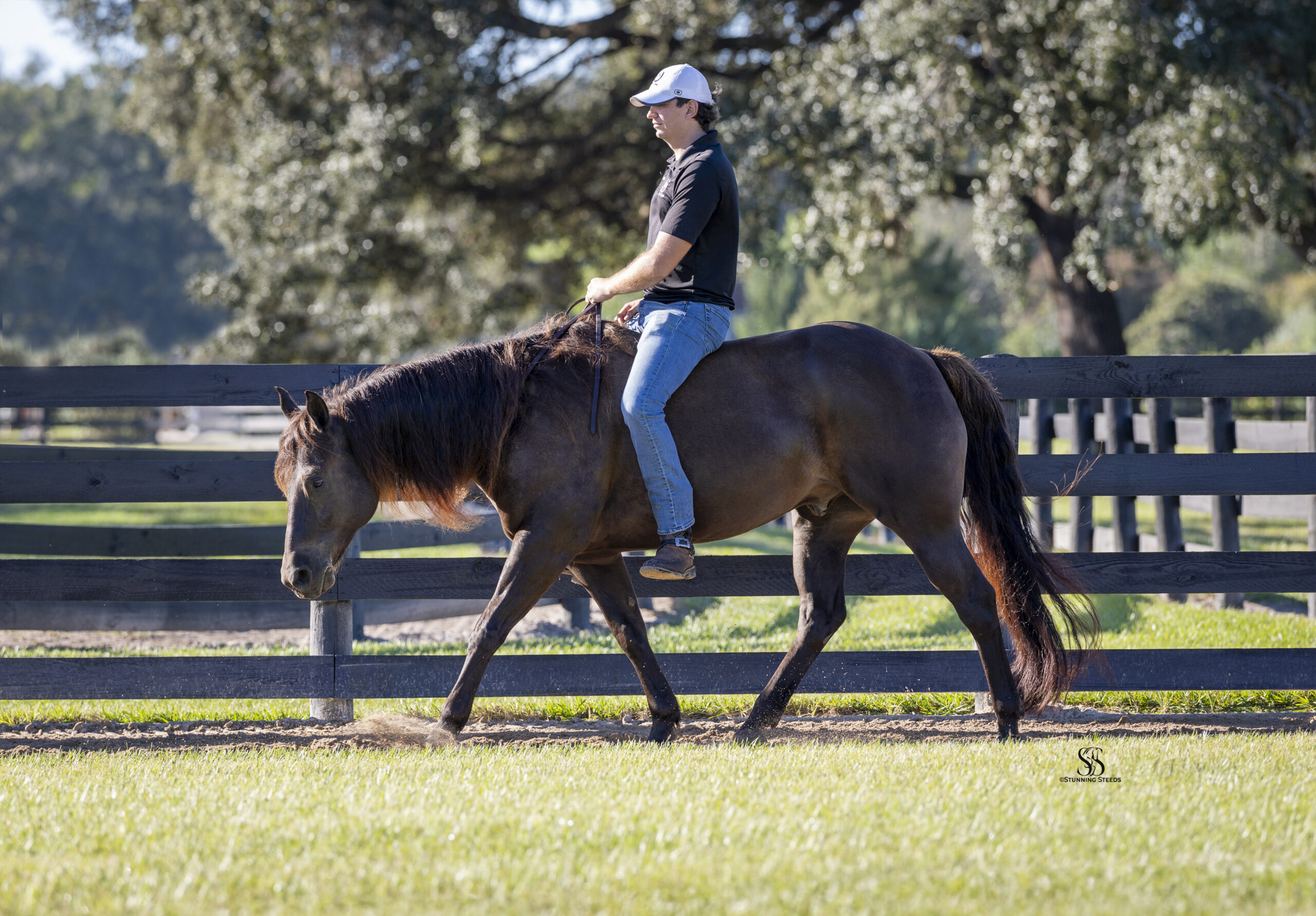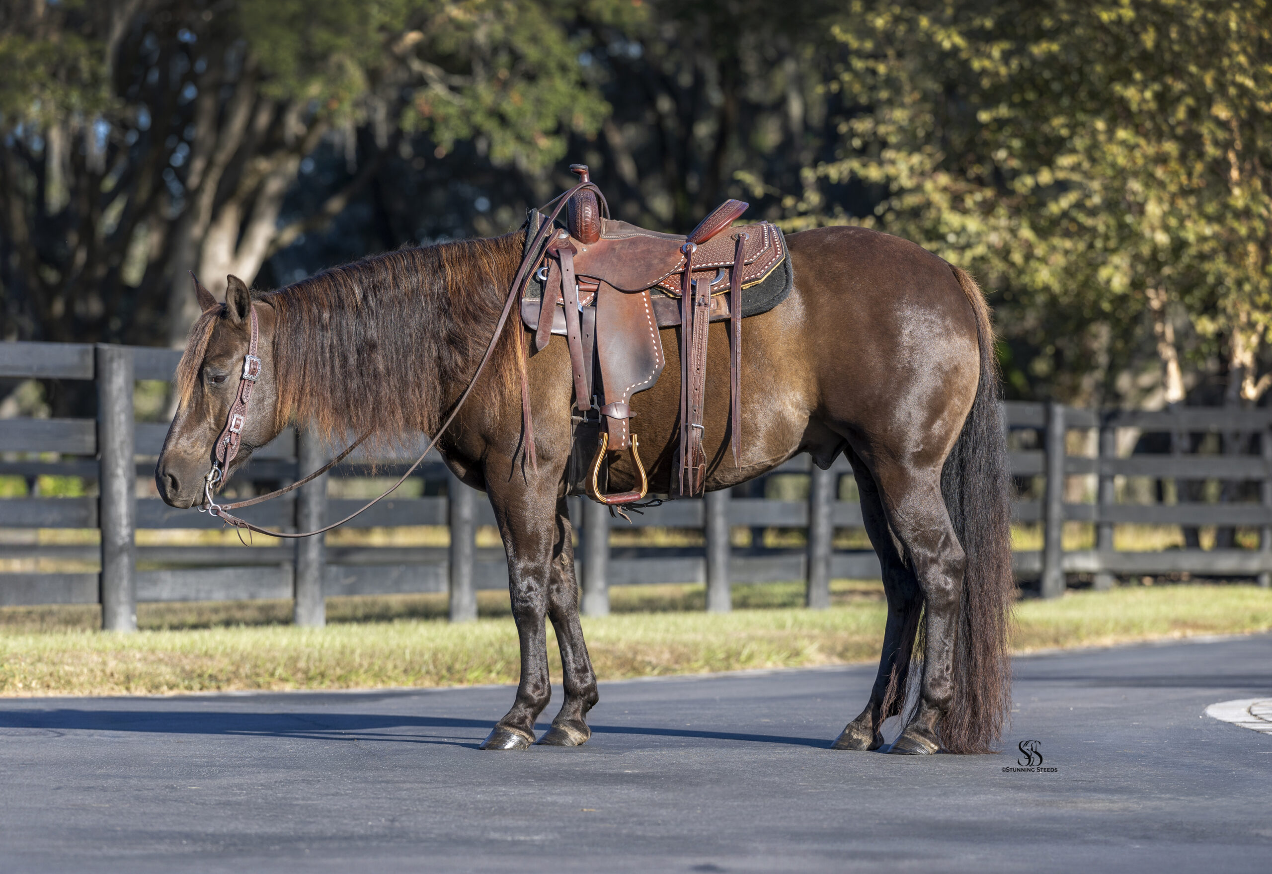 Beyond his training, Chocolate Chip truly stands apart in character. He is kind, people-oriented, and confident, always meeting you at the gate and eager to interact. He can be mounted bareback from the fence without tack, willingly parks himself by the gate for easy opening, and will even close it with his nose when asked. His ground manners are impeccable, and he is a joy to handle in every setting.
