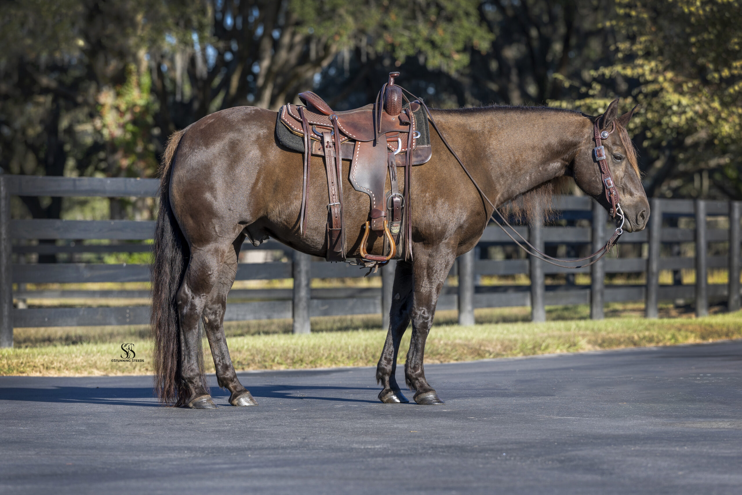 He is soft, correct, and highly educated, with solid lead changes, smooth and balanced transitions, correct spins, and impressive sliding ability. He is also trained to lay down on command, a testament to his intelligence, trust, and calm, willing nature. Chocolate Chip is responsive and light, providing a refined feel while remaining honest, forgiving, and exceptionally safe making him suitable for beginners and youth riders, yet deeply appreciated by experienced horsemen.